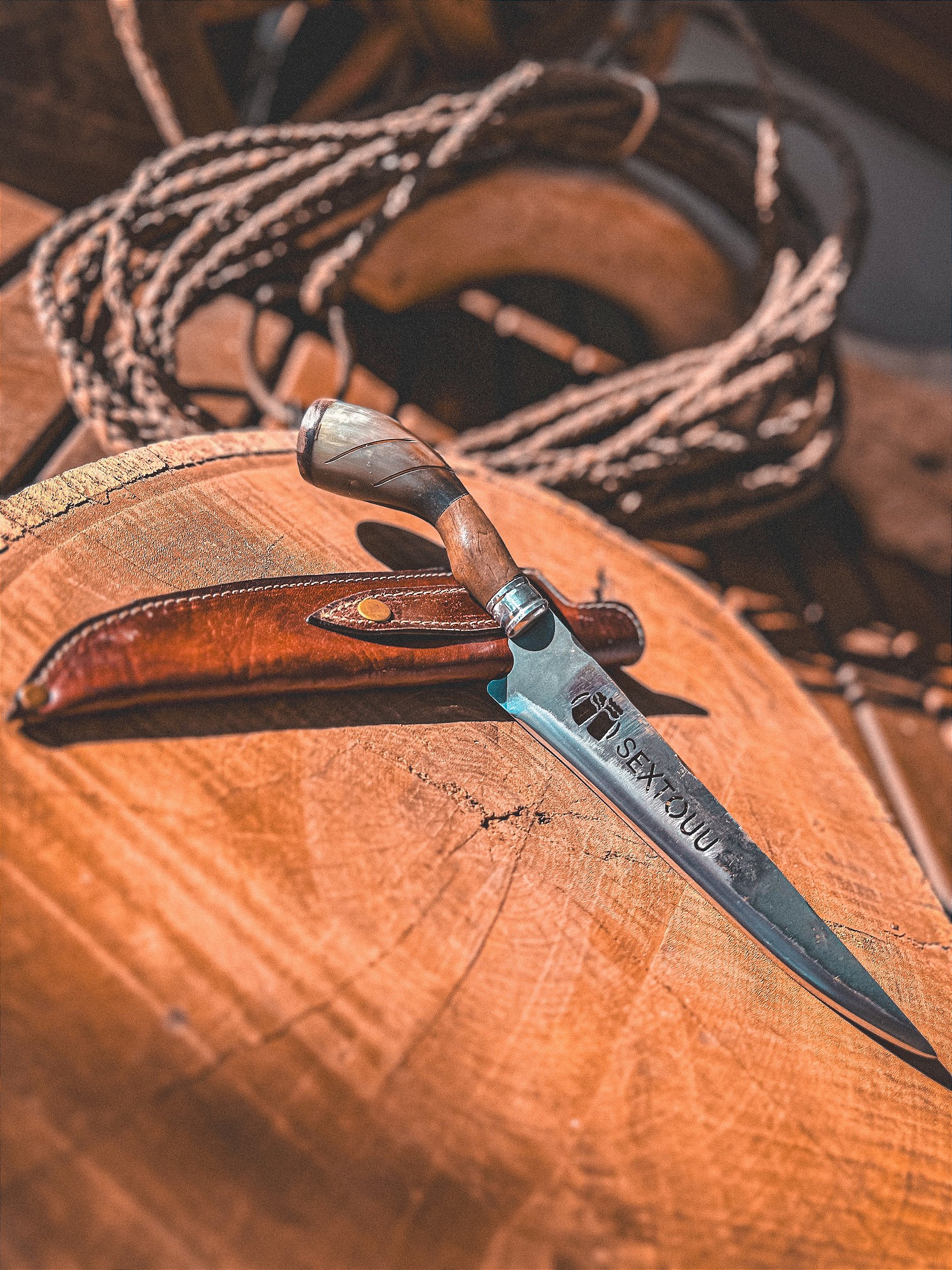 Faca em Aço carbono 1070, com cabos mesclado em chifre e madeira. Lâmina com 9 polegadas de com têmpera Integral e revenida, acompanha bainha em couro na tonalidade marrom café.